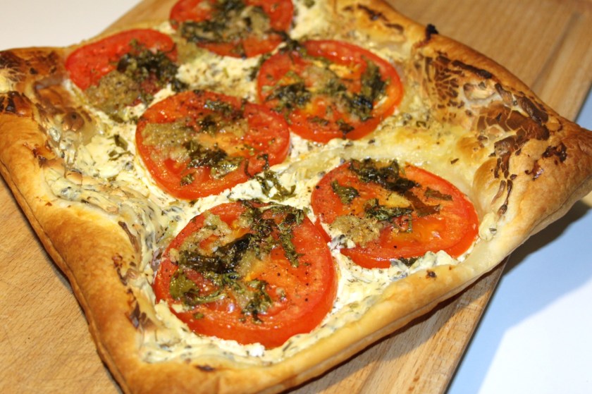 Jeg faldt over en ny friskost på tilbud. Sådan et to for tyve tilbud. En Buko med basilikum. Basilikum og tomat er altid en god kombination, og med lidt færdig butterdej i køleskabet fandt jeg på den her lille tærte til fredagsnippemaden i sidste uge.