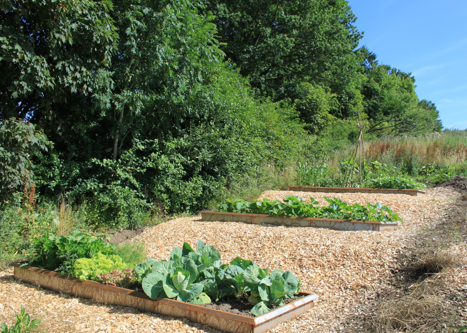 Stigningen i markbedet er så stor, at højbedene skal stå på terrasser for at stå lige. Nærmest som en olivenplantage på en bjergskråning i Toscana. Der er gravet ud, så der er plads til højbedene og plads til at gå omkring dem.